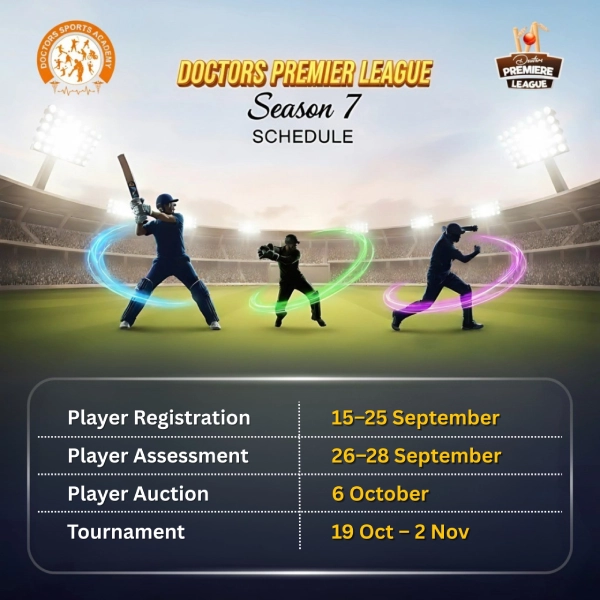 The much-awaited Doctors Premier League – Season 7 is here! Player registrations will be held from 15th to 25th September, followed by player assessments from 26th to 28th September. The Player Auction is scheduled for 6th October, and the grand tournament will take place from 19th October to 2nd November. Get ready for an exciting season of cricket, teamwork, and sportsmanship!
